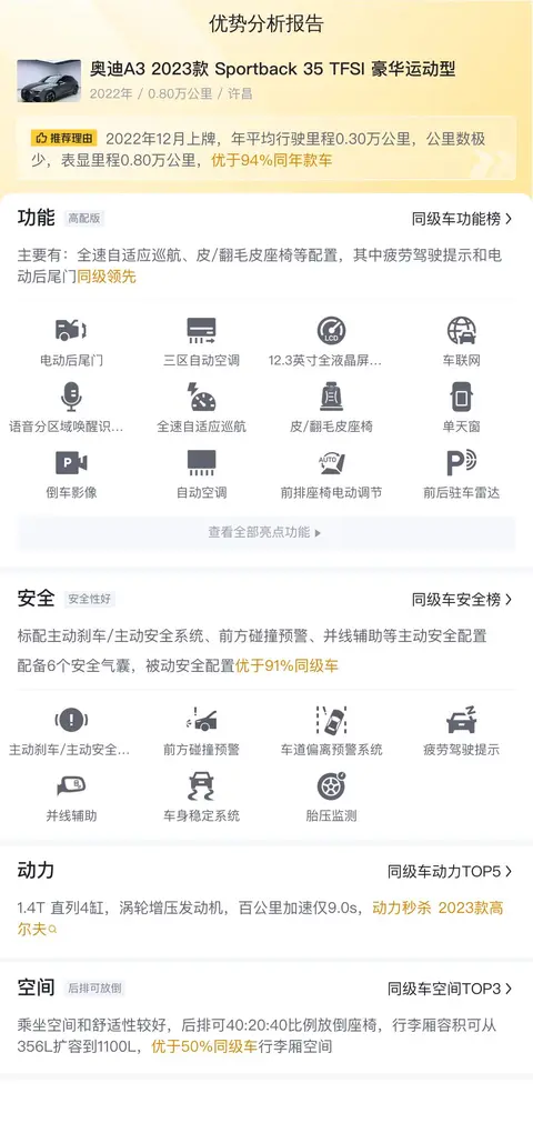综上所述的新车含税价、用车成本、市场行情、优势分析、同款比价等数据仅供参考。在配置部分,因为二手车非标品,车辆可能会存在配置改装的情况,具体车况信息需要线下结合车辆实际情况进行综合参考。