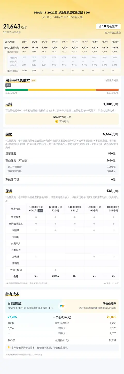 在用车成本方面,Model 3 2021的官方数据显示,其百公里耗电量为12.6kWh。按照当前电费计算,每百公里的电费大约为10元左右,相较于燃油车而言,能源成本显著降低。此外,电动车的维护成本相对较低,主要是日常检查、更换少量易损件以及电池和电机系统的检查。保险费用方面,根据往年的情况,交强险加上商业险(通常包括第三者责任险和盗抢险等),每年的保险费用大约在4000元左右。具体金额可能会因保险公司和保险方案的不同而有所差异。总体而言,Model 3 2021的用车成本相对较为经济,特别是在电费节省方面表现出色。