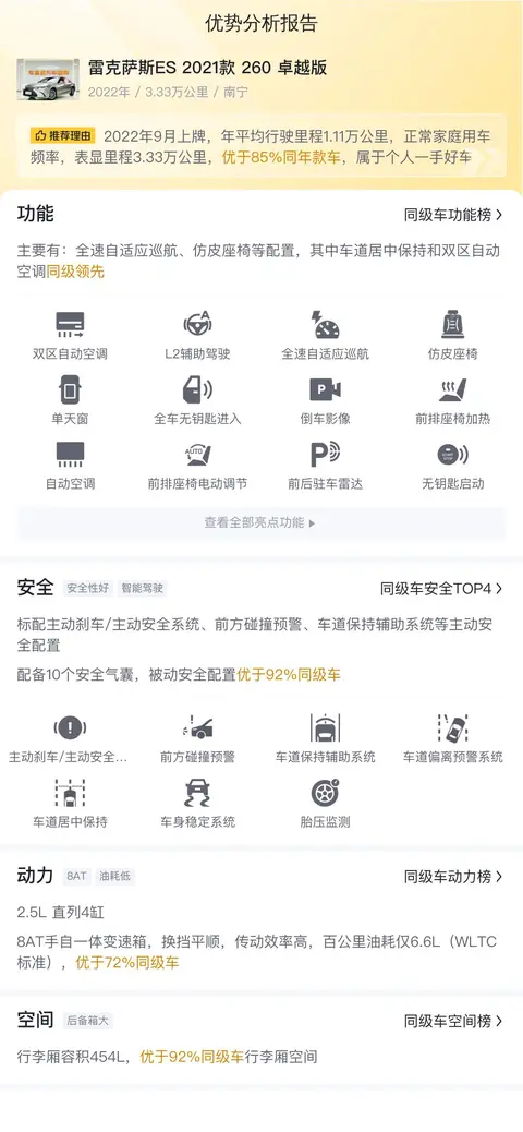 在用车成本方面,这款雷克萨斯ES 2021款 260 卓越版同样具有一定的优势。根据相关数据显示,这款车10年平均用车成本为6640元/年,这一数据优于63%的同级别车型。较低的用车成本,使得这款ES 260更加适合追求高品质生活的消费者选择。选择购买这款二手车,您不仅能够享受到雷克萨斯带来的卓越品质和尊贵体验,同时还能够在日常使用过程中节省下一笔不小的开支,让您的生活更加轻松愉悦。
