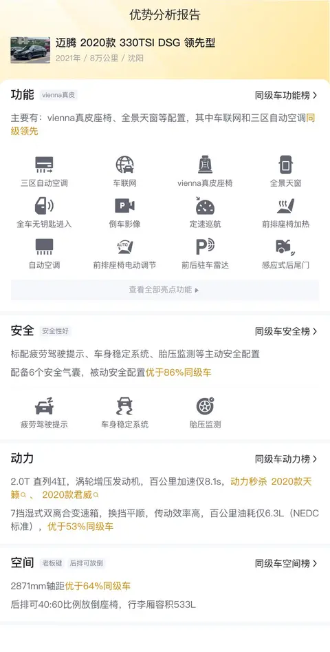 这辆迈腾 2020款 330TSI DSG 领先型在动力性能、内饰舒适度、操控安全等方面表现出色,适合家庭用车和商务出行。缺点方面,内饰科技感略显不足,刹车系统需谨慎驾驶,电子设备长期使用可能发热。总体而言,作为一款综合表现良好的B级轿车,适合那些追求舒适性和实用性的消费者。