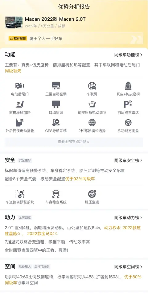 综上所述,这辆Macan 2022款 Macan 2.0T在二手车市场上表现出了极高的性价比和竞争力。无论是从外观、内饰、性能、配置还是安全等方面来看,它都展现出了保时捷品牌的精湛工艺和卓越品质。如果您正在寻找一款既豪华又实用的二手车,那么这辆Macan 2022款 Macan 2.0T绝对是一个不容错过的选择。