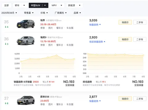 在燃油动力中型SUV市场,奇瑞瑞虎9潜在竞品包括红旗HS5(指导价18.38万-24.98万元)、星途瑶光(指导价14.98万-20.68万元),以及相似价位段的燃油中大型SUV,例如广汽传祺GS8(指导价15.98万-25.08万元)、长安CS95(指导价17.59万-19.99万元)等。奇瑞瑞虎9 C-DM潜在竞品则指向同级的比亚迪唐DM(指导价17.98万-21.98万元)、捷途山海L9(指导价16.49万-18.59万元)等。参考销量,奇瑞瑞虎9 8月销量为2920辆,位列当月中型SUV销量榜第36位,奇瑞瑞虎9 C-DM 8月销量为616辆。有关奇瑞品牌的更多消息,我们将保持关注。