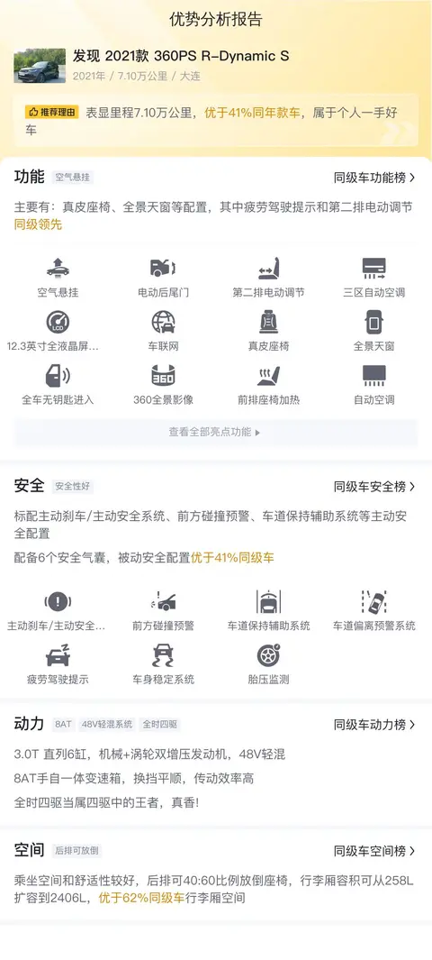 咱们今天要说的这辆发现 2021款 360PS R-Dynamic S,是2021年10月在大连上的牌照,至今行驶里程仅为7.1万公里,仅过户1次。外观为黑色,内饰为深色。符合国VI排放标准,二手车现价为41.8万元。