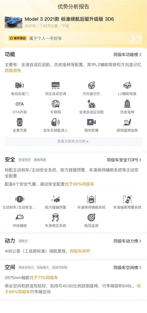 首先,我们来聊聊这款二手Model 3 2021款 标准续航后驱升级版 3D6的基本情况。它出生于2021年,现落户宁波,是一位年轻的小鲜肉哦!它身穿黑色战袍,神秘而又性感。虽然年纪轻轻,但它已经跑了7.8万公里,看来前主人对它是真爱,天天开着它到处浪啊浪~不过,人家保养得当,车况那是杠杠滴!