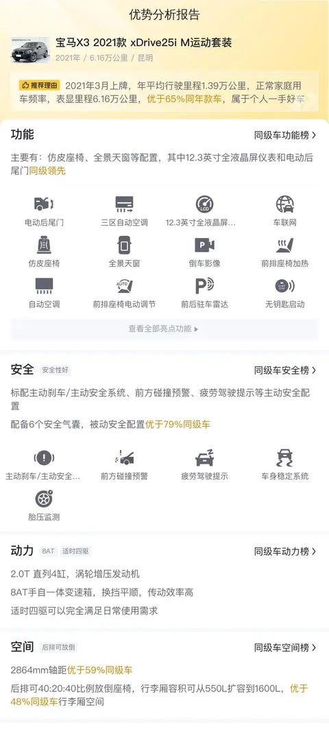 本篇介绍的是一款宝马X3 2021款 xDrive25i M运动套装,首次上牌时间为2021年3月,上牌地和车源地均为昆明,表显里程6.16万公里,新车指导价38.98万元,本文撰写时的二手车报价为20.2万元,过户次数0次。支持分期购车,首付低至5.91万,即可将爱车开回家。