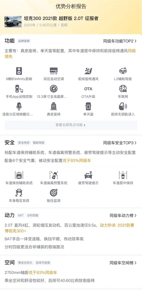 这辆坦克300 2021款 越野版 2.0T 征服者自从上市以来一直有不错的热度,从销量上来看得到了不少车友的认可,二手车的保值率一直居高不下,所以从投资的角度来看,这辆车是一个不错的选择,16.9万的二手售价,3年多的时间里有5.9万公里的行驶里程,平均下来跑的不算多,内饰的通风加热功能在秋冬季会显得更加实用,如果有喜欢越野车,但城市代步又不想牺牲舒适性的车友,那这辆坦克300值得考虑。