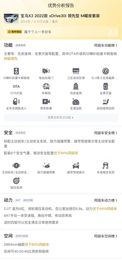 综上所述的新车含税价、用车成本、市场行情、优势分析、同款比价等数据仅供参考。在配置部分,因为二手车非标品,车辆可能会存在配置改装的情况,具体车况信息需要线下结合车辆实际情况进行综合参考。