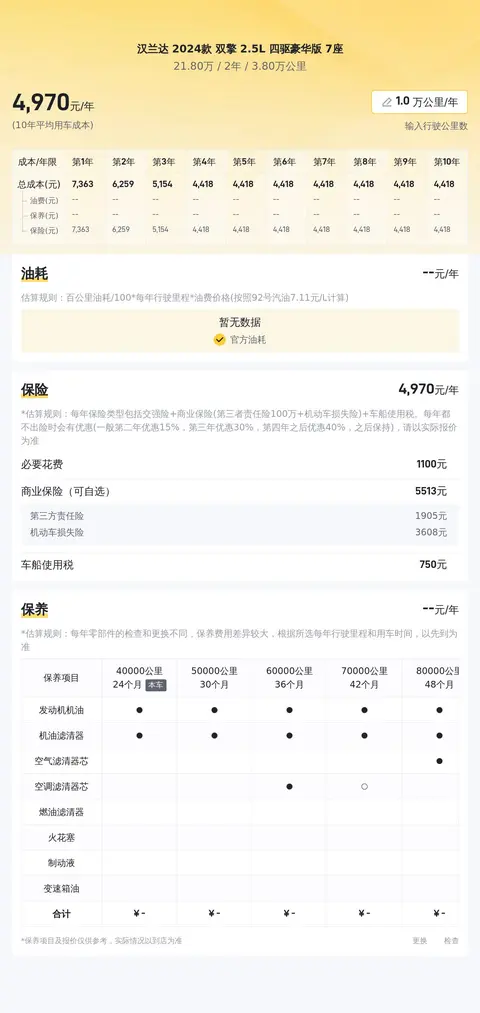 关于用车成本部分,该车每年保险费用约4248元,保养费用大约563元,而且百公里油耗为5.97L,燃油费用大约4867元,合计每年用车成本大约9678元,这个用车成本是比较低的。需要注意的是,上述数据仅供参考,实际费用可能根据您的用车习惯和保养内容有所变动。