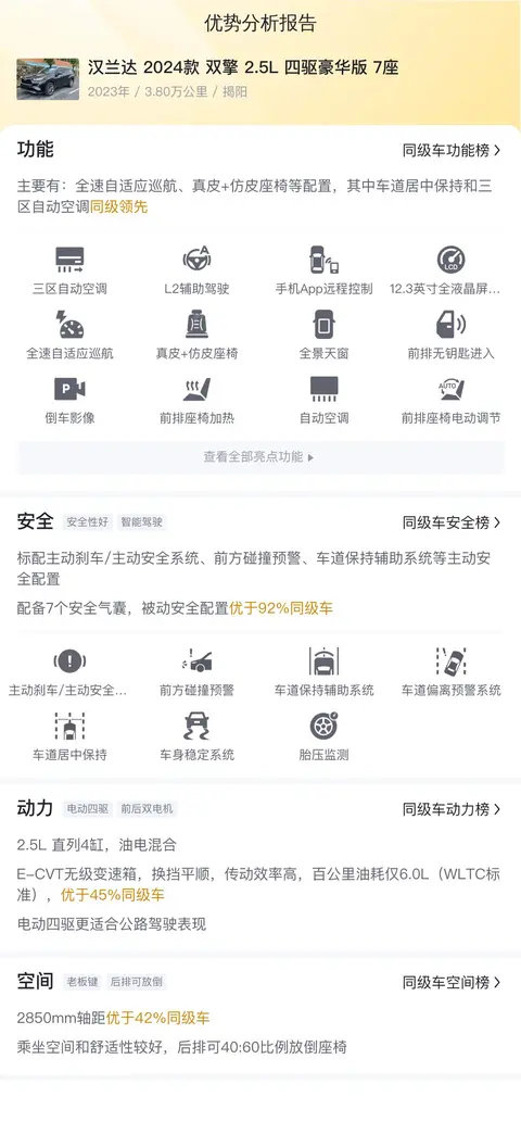 接下来,让我们一起看看这款车在配置、动力、空间等方面相对于同级别竞品的表现如何。该车在功能配置方面表现适中,既未过于奢华也未显得过于朴素,符合大多数消费者的日常需求。在动力性能方面,其油电混合动力系统不仅保证了必要的动力输出,还有效控制了燃油消耗,是比较大的一个优势。而在空间方面,汉兰达一如既往地表现出色,无论是乘坐空间还是储物空间,都能满足大多数家庭的需求。值得一提的是,该车在后排座椅放倒比例、行李舱容积以及后排座椅倾斜角度调整等方面,与竞品车型相比,都具有一定优势,具体优势分析报告如下所示。