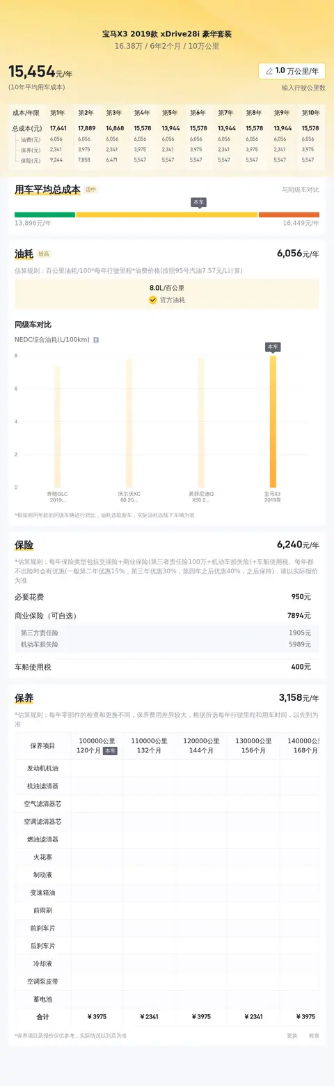 在购买二手车时,除了考虑购车成本外,还需要合理预期日常使用和保养的成本。根据相关数据显示,宝马X3 2019款 xDrive28i 豪华套装的10年平均用车成本大约在12709元/年左右。这一数据仅为参考值,实际用车成本可能会因多种因素而有所不同。