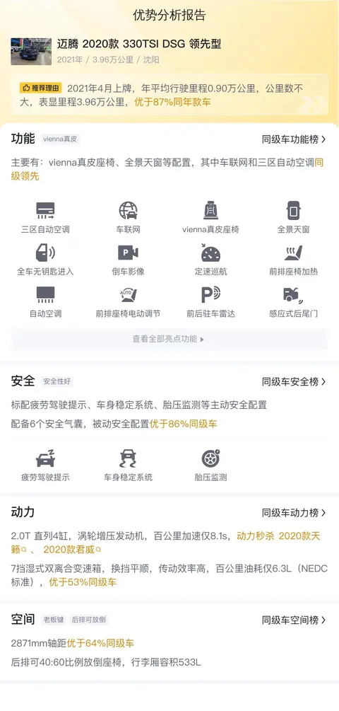 这辆迈腾 2020款 330TSI DSG 领先型各方面表现都不错,配置、性能、空间都在正常水平,不过舒适性差强人意,而且12.58万的价格并不算低,还是要综合考虑。