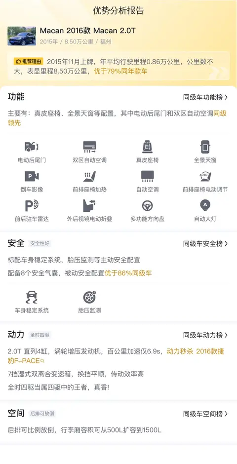 这辆Macan 2016款 Macan 2.0T优势比较明显,比如在品牌影响力上,保时捷的名号会让很多消费者青睐;车型的操控性极好,方向盘精准,底盘扎实,驾驶起来非常有乐趣。