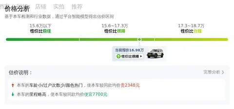 根据懂车帝的数据,这辆坦克300 2024款 2.0T 征服者的市场行情在14.17-16.87万之间,具体的售价要看车辆的车龄、里程、过户次数等情况而定。按照目前这辆车的车况,售价16.98万,价格是偏高的。