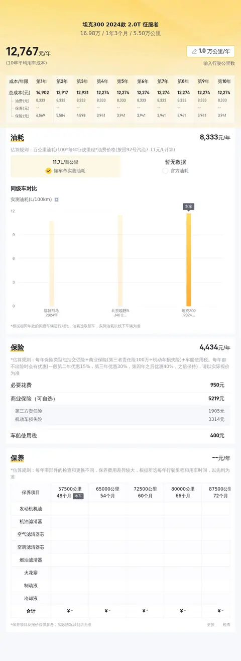 按照每年行驶2万公里计算,10年平均用车成本约15153元/年,油费约11180元/年,保险约4789元/年,保养约1351元/年。用车成本跟车主的实际使用情况有直接关系。