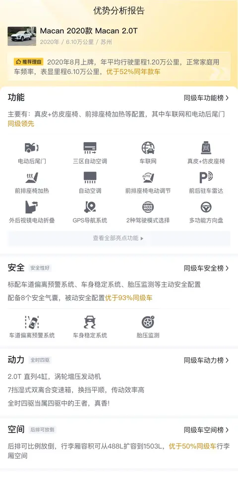 优势方面,这辆Macan 2020款 Macan 2.0T因为是高版本车型,所以配备的电动调节座椅、电吸门以及全景天窗等舒适性配置较为丰富,在日常用车过程中可以享受到更加豪华的用车体验。并且这辆Macan 2020款 Macan 2.0T的发动机动力储备充足,是一大优势。