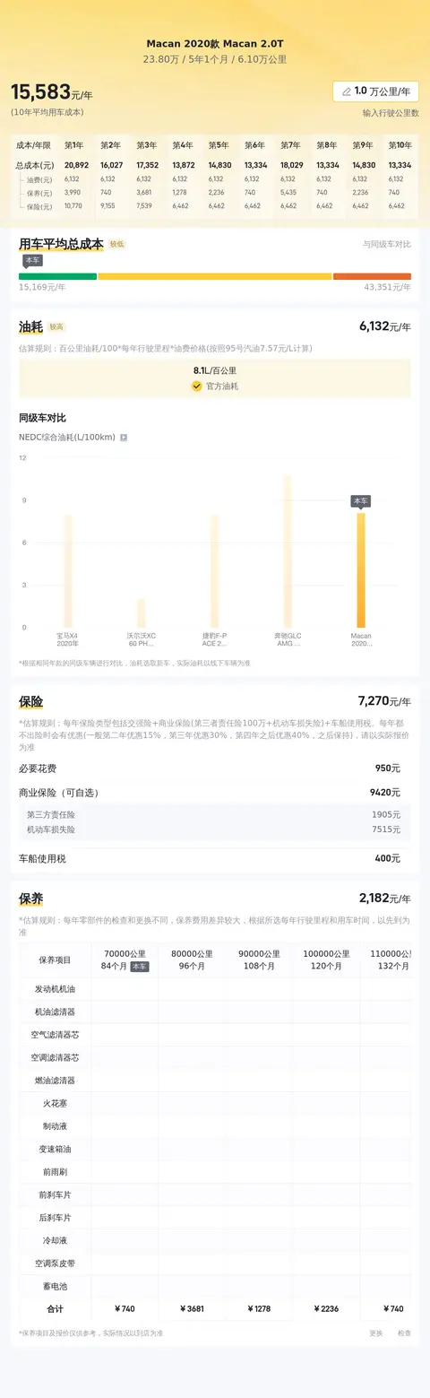 据估算,Macan 2020款 Macan 2.0T的用车成本较低,因为它的用车成本是15685元/年,同级车最低是15030元/年,最高是19726元/年。