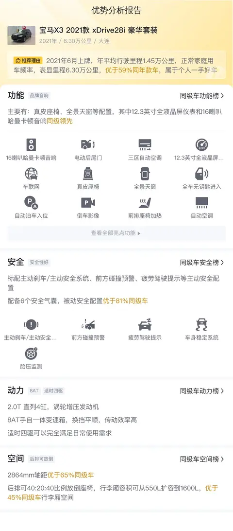 该车具体版本为宝马X3 2021款 xDrive28i 豪华套装,上牌日期2021年6月,上牌地大连,表显里程6.3万公里,黑色漆面,未过户,新车指导价42.58万,目前二手车报价20.3万。