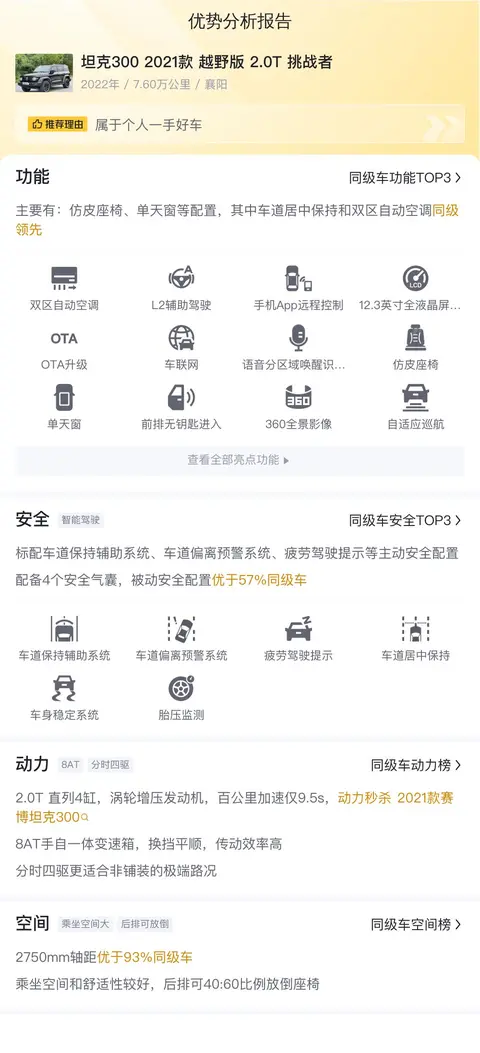 据估算,同级车的最低用车成本是6506元/年,最高是12856元/年,坦克300 2021款 越野版 2.0T 挑战者是12186元/年,所以用车成本也较高。