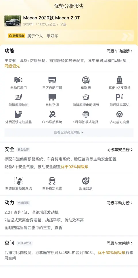 总之,Macan 2020款 Macan 2.0T是一款集豪华与性能于一身的SUV,外观帅气,内饰豪华,动力强劲,深受年轻人喜爱。不过,作为二手车来说,油耗大、保养费用高、车内空间小等问题也需要考虑。需要根据个人经济实力和使用需求来衡量。对于追求豪华品牌和高性能的消费者来说,Macan绝对是一个不错的选择。