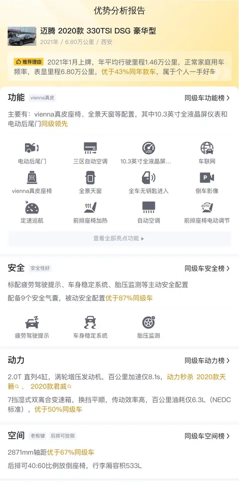 优势:价格实惠,不到12万的价格就能拿下,行车里程不高,而且大众迈腾的名气比较大,市场欢迎度高,保值率也高。动力强劲,配置也不错,整体来看还是很有性价比的。