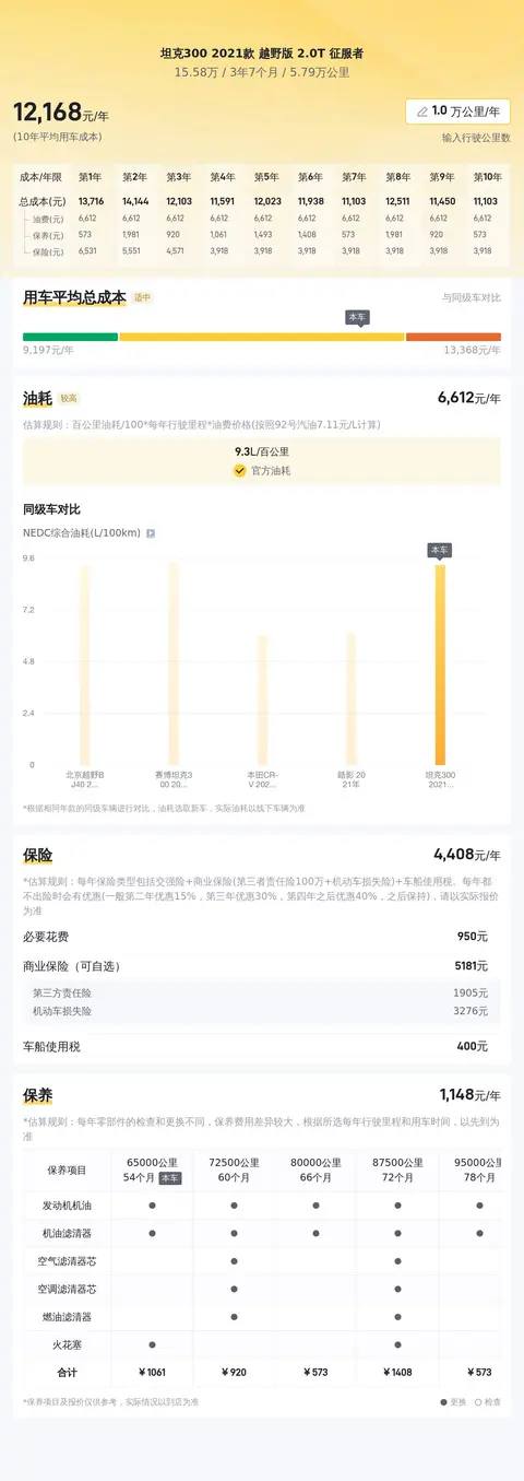 根据估算,这辆车年均综合用车成本大概在每年1.2万元左右。这项花销是跟车主的实际用车场景和使用强度有直接变化的。