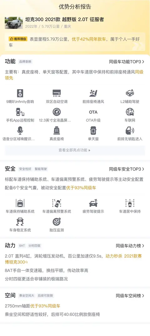 在优势分析部分,这辆车主要有:真皮座椅、单天窗等配置,其中车道居中保持和前排座椅通风同级领先。
