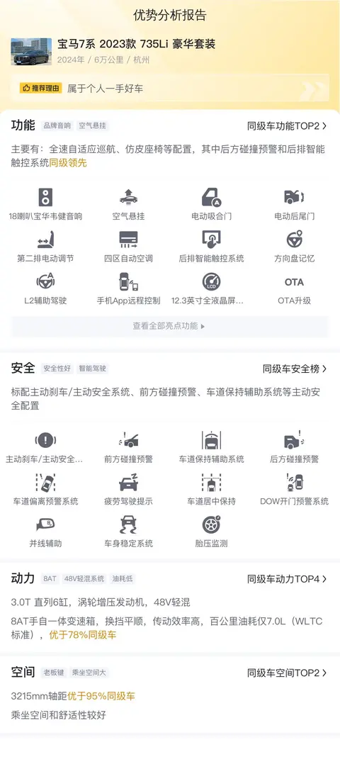 综上所述,这辆二手宝马7系2023款735Li豪华套装是一个兼具豪华、性能和性价比的选择。它拥有大气的外观设计、奢华的内饰配置、出色的动力性能和全面的安全保障,适合追求高品质生活的商务人士和家庭用户。在合理预算范围内,购买这样一辆二手车不仅能节省一大笔开支,还能享受到宝马7系带来的尊贵驾乘体验,可谓物有所值。