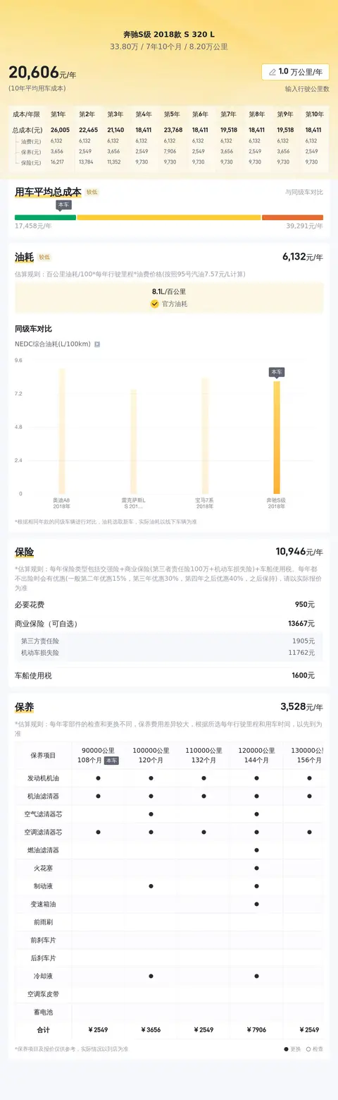 据估算,同级车的最低用车成本是18881元/年,最高是46998元/年,奔驰S级 2018款 S 320 L是20538元/年,所以不算高。