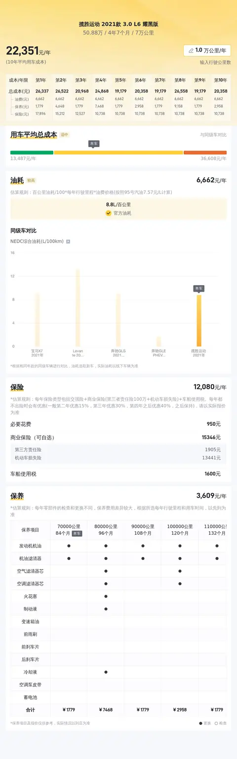 除了市场行情,我们还计算了这款揽胜运动10年平均用车成本,包括每年加油、保养以及保险的费用开销,具体详情,可以参考文中图片车况部分。