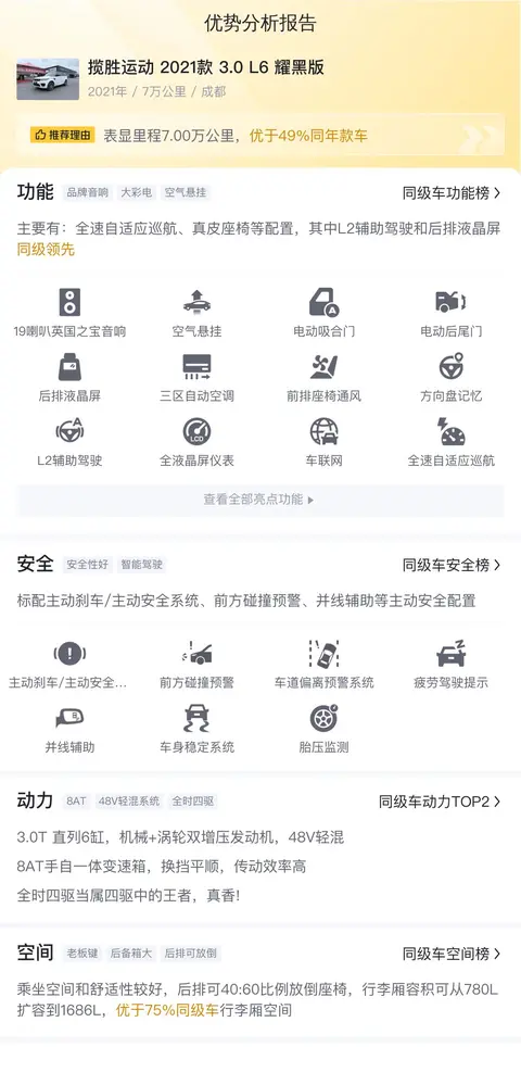 综上所述的新车含税价、用车成本、市场行情、优势分析、同款比价等数据仅供参考。在配置部分,因为二手车非标品,车辆可能会存在配置改装的情况,具体车况信息需要线下结合车辆实际情况进行综合参考。