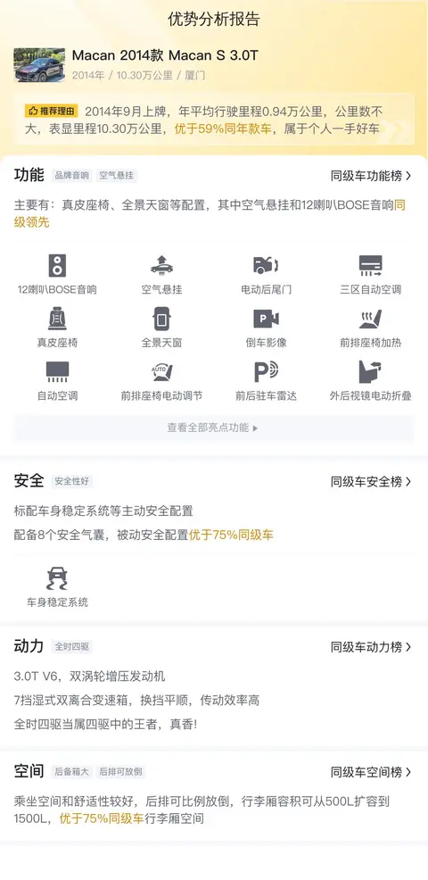 今天为大家带来的这款二手保时捷Macan是2014款Macan S 3.0T版本,采用咖啡色外观,内饰颜色为深色。车辆来源于厦门,上牌日期为2014年9月,至今行驶里程约为10.3万公里。新车指导价为68.8万元,而当前卖家报价为13.68万元,相较于新车价格,二手价格更为经济实惠。车辆搭载了一台3.0T V6双涡轮增压发动机,最大功率为340马力,峰值扭矩为460牛·米,匹配7挡双离合变速箱和全时四驱系统,提供了强劲的动力性能和优秀的操控体验。百公里加速仅需5.4秒,不仅适合日常出行,也能够满足驾驶者对于速度与激情的追求。车内采用真皮座椅和全景天窗等高端配置,营造出了豪华舒适的驾乘环境。同时,车辆还配备了先进的安全系统和驾驶辅助系统,确保了行车的安全性和便捷性。无论是追求驾驶乐趣的爱好者还是注重舒适性的家庭用户,这款Macan都能为您提供理想的选择。