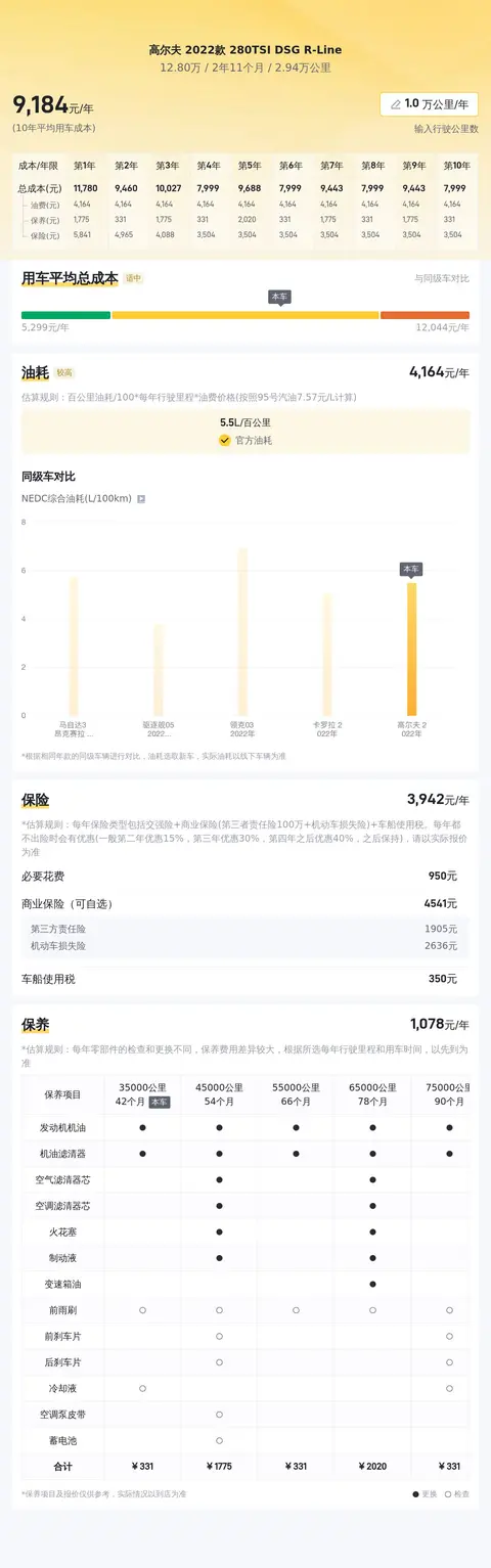 在用车成本方面,该车官方公布的百公里油耗为5.5升,按每年行驶一万公里计算,燃油费用约为4687元。该车每年的保险费用约为3668元,十年平均保养费用约为1148元。每年的停车费加洗车费大约需要2400元,每月计算200元。每年的高速公路费用大约需要1200元,每月计算100元。每年的餐饮和休息站消费大约需要1200元,每月计算100元。每年的车辆损耗折旧大约需要908元,每月折旧75.67元。综上所述,高尔夫 2022款 280TSI DSG R-Line 的每年用车成本大约需要15,081元,每月用车成本大约需要1256元,每天用车成本大约需要41.88元。这个用车成本是一个大致的估算,实际费用可能会因个人驾驶习惯、用车频率、油价波动等因素而有所不同。希望这个估算能帮助您更好地规划和预算您的用车费用。