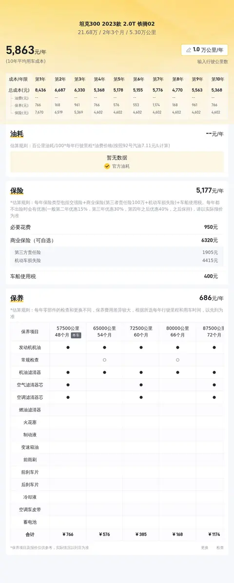 据估算,坦克300 2023款 2.0T 铁骑02的用车成本是7990元/年,原价30多万的车,每年的花费是7990元,也算是合理。