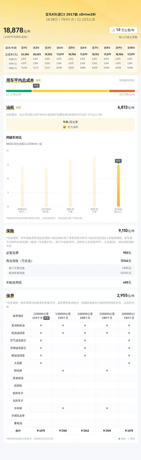 养车成本方面,该车官方公布的百公里油耗为9L,按照当前油价计算,每年的燃油费用约为7461元。保险方面,预估每年保费约为8154元,但实际金额会根据车主的驾驶习惯和车辆状况等因素有所调整。保养方面,该车建议每行驶1万公里进行一次保养,预计每年的保养费用为4101元。总体来看,这台二手车的用车成本较低,性价比较高。