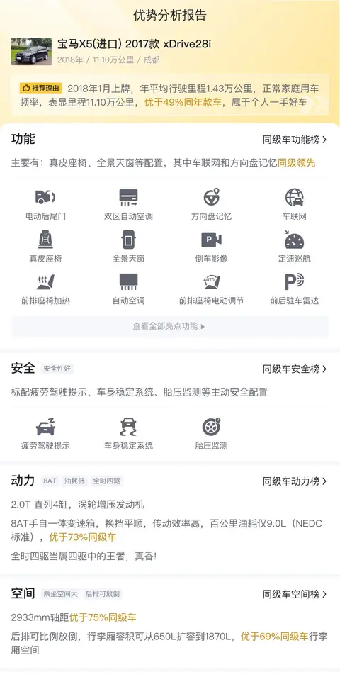 该车在二手车市场上的竞争力较强,主要得益于以下几个方面:首先,该车采用了全时四驱系统,能够提供出色的越野性能和通过性,对于追求驾驶乐趣和户外探险的消费者来说,具有很大的吸引力。其次,该车搭载了2.0T直列4缸涡轮增压发动机和8AT手自一体变速箱,确保了动力充沛且换挡平顺,同时百公里油耗仅为9.0L(NEDC标准),在保证驾驶乐趣的同时,也考虑到了燃油经济性。再次,该车配备了真皮座椅、全景天窗等舒适性配置,以及车联网、方向盘记忆等智能互联和便捷操作配置,为驾乘者提供了高品质的驾乘体验。最后,该车在空间方面表现出色,2933mm的轴距和可扩容至1870L的行李厢容积,满足了消费者对于大空间和高灵活性的需求。