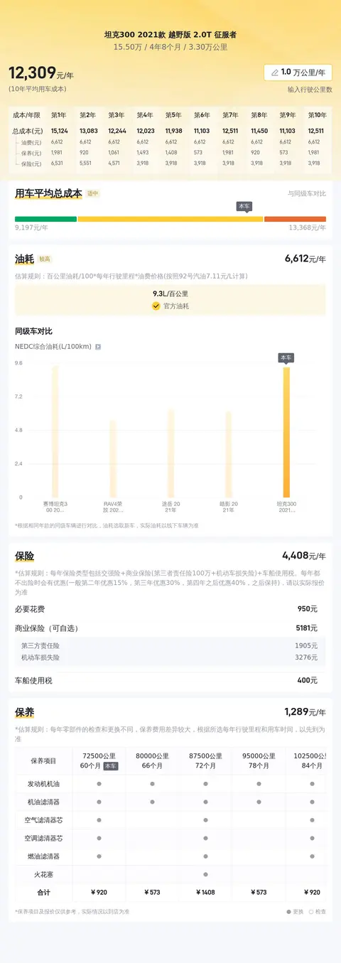 当前市场上,这款坦克300的二手车行情大致在13.15万至16.16万之间,当然,市场行情和车辆最终成交价是有差异的,车辆的最终售价会受到车龄、里程、车况以及保养情况等因素的共同影响。关于用车成本方面,根据懂车帝对坦克300 2021款 越野版 2.0T 征服者的分析,该车10年平均用车成本约为12,341元/年。