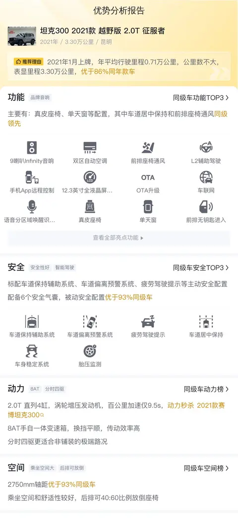 在二手车市场中,找到一辆性价比高、车况良好的车型是每个购车者的愿望。今天,我们聚焦于坦克300 2021款 越野版 2.0T 征服者这款车型,从各个方面对其进行了详细的解析。从车辆的基本情况,包括行驶里程和过户次数,到其在市场行情中的定价位置,以及车辆配置、性能、安全和舒适性等方面的详细介绍,我们致力于让您全面了解这款车型的优势所在。最后,通过对竞品的对比,我们展示了这款车在同级别车型中的竞争力。在综合考虑了各种因素后,相信您对这款坦克300 2021款 越野版 2.0T 征服者有了更深入的了解。如果您正在寻找一款性能出色、配置丰富且价格合理的二手车,那么这款坦克300无疑是一个值得考虑的选择。