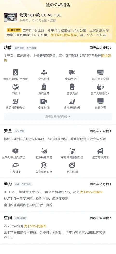 优势方面,这辆发现 2017款 3.0 V6 HSE在动力储备丰富,得益于3.0T V6,机械增压发动机,百公里加速仅7.1s,能带给驾乘人员充足的驾驶信心;功能配置方面比较丰富,无论是疲劳驾驶提示还是空气悬挂都属于同级别的领先水平;同时2923mm轴距优于53%同级车,乘坐空间和舒适性较好,后排可比例放倒,行李厢容积可从258L扩容到2406L,可以容纳更多物品。