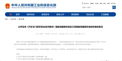 好在工信部已经在推进《汽车车门把手安全技术要求》的强制标准,里面明确: