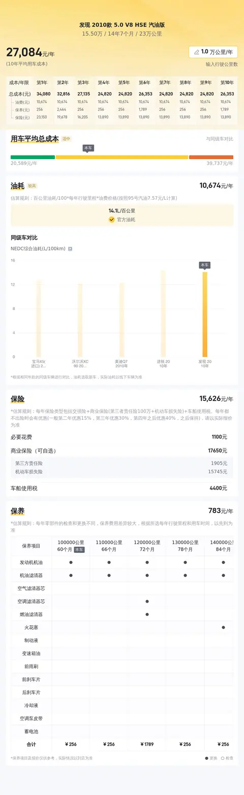 在不考虑其他费用大幅波动的情况下,根据估算,这辆车的年均综合用车成本约27072元,具体费用包括每年约11110元的油费、约5104元的保养费以及约10858元的保险费。