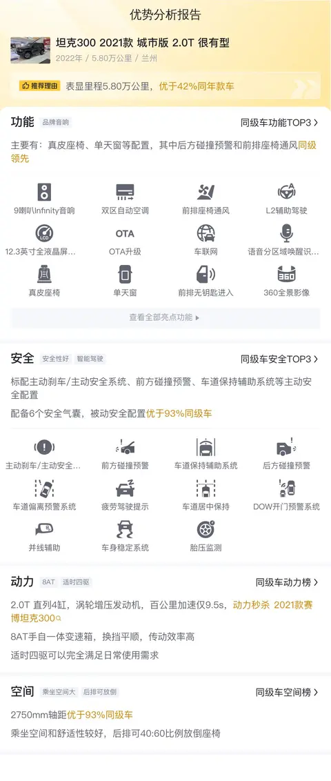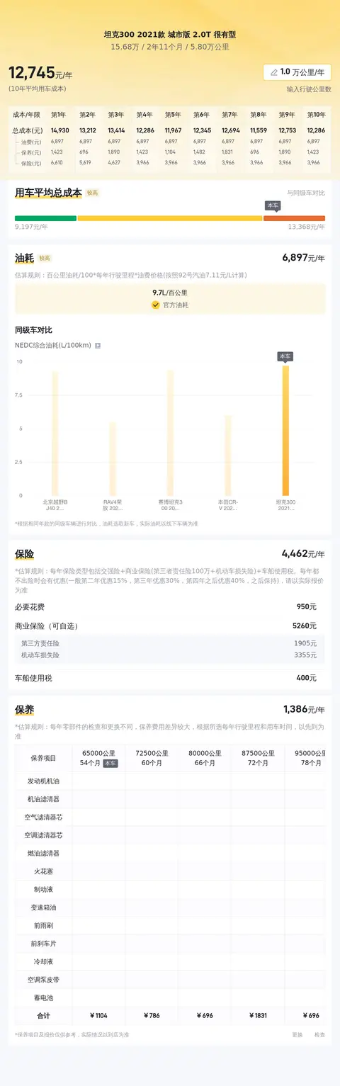据估算,同级车的最低用车成本是12706元/年,最高是16678元/年,坦克300 2021款城市版 2.0T很有型是13114元/年,所以用车成本较低。