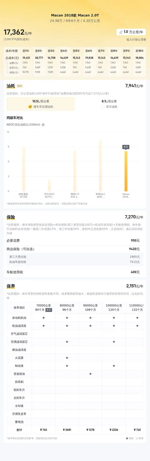 说到用车成本,这款车的百公里油耗为8.1升,年均保险费约9749元,年均保养费约6246元,这些是在选择这款车时需要考虑的因素。