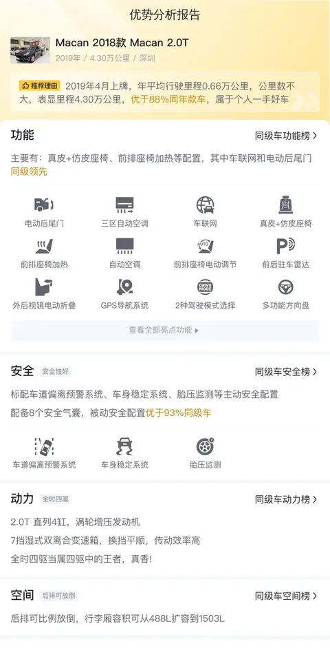 先让我们来了解一下这辆二手保时捷Macan的基本情况。它是一款2018款的Macan 2.0T车型,上牌地为广东深圳,上牌日期2019年4月,表显里程4.3万公里,新车指导价54.5万,二手车报价24.98万,车身颜色为咖啡色,四驱,国VI排放标准,可迁移到外省。