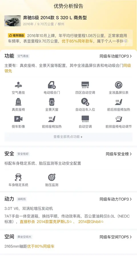 这辆奔驰S 2014款 S 320 L 商务型配备了真皮座椅、全景天窗等配置,其中全液晶屏仪表和电动吸合门同级领先。在动力方面,搭载了3.0T V6双涡轮增压发动机,最大功率是272马力,最大扭矩是400牛·米,与之匹配的是7挡手自一体变速箱,换挡平顺,传动效率高,百公里油耗仅8.0L,优于40%同级车。在空间方面,它的轴距是3165mm,优于80%同级车,内部空间宽敞,乘坐舒适。