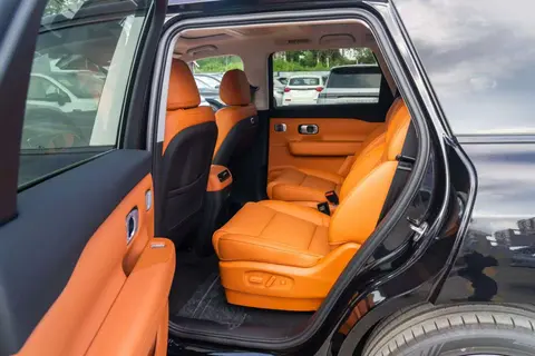 我们安排了三位不同身高的体验者进行测试:身高182cm的成年人坐进前排,调整好驾驶坐姿后,头部空间仍有一拳余量,座椅靠背的侧翼支撑能在过弯时提供足够包裹性。保持前排座椅不动进入第二排,腿部空间直接达到两拳以上,头部空间也有一拳左右。第二排独立座椅的设计堪称"移动沙发",支持电动调节前后和靠背角度,靠背可放倒145°,选装腿托后几乎能实现半平躺状态,孩子在上面睡觉特别安稳。