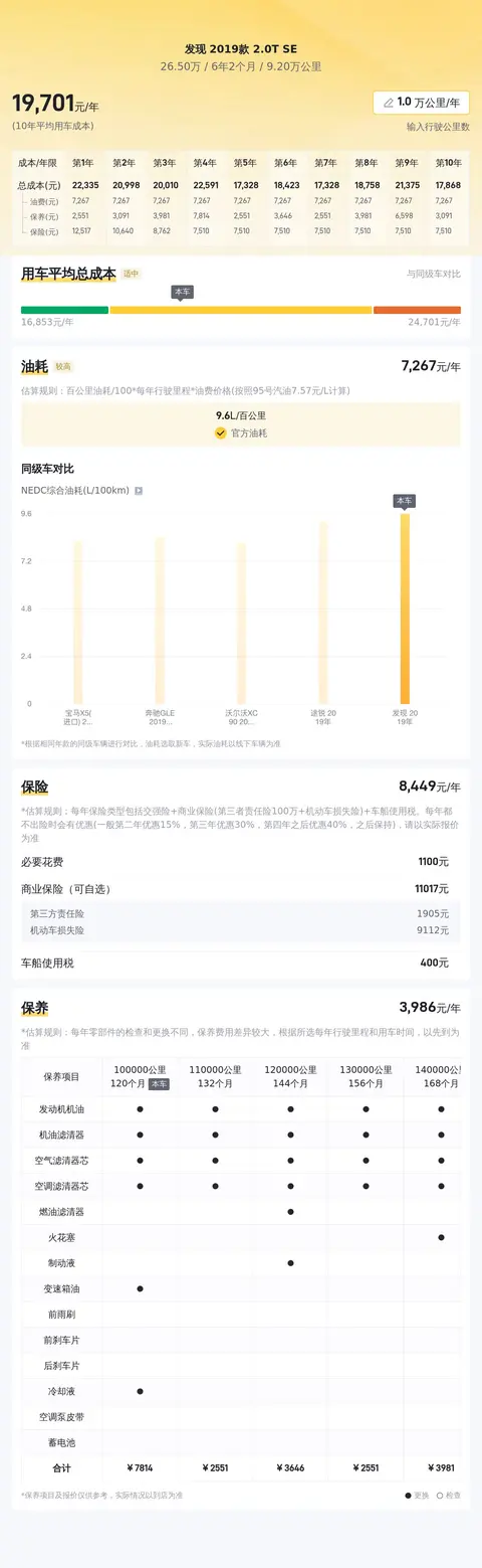 据估算,同级车的最低用车成本是17409元/年,最高是23736元/年,发现 2019款 2.0T SE是20308元/年,所以它的用车成本适中。