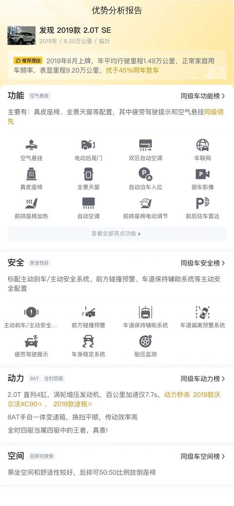 综上所述,对于想要购买二手车的朋友来说,此款发现 2019款 2.0T SE还是可以考虑一下的,此款车在外观、内饰、动力等方面的表现还是不错的,虽然内饰稍微有使用痕迹,整体感觉比较老旧,但基本的使用功能都没有缺失,不影响使用。再加上此款车现在二手报价26.50万,比较实惠,所以还是具有很高的性价比的。