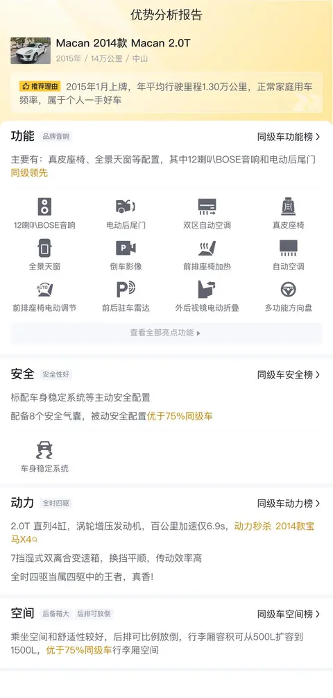2014款的车,对于配置的要求是要实用。Macan 2014款 Macan 2.0T配备了真皮座椅、全景天窗、12喇叭BOSE音响、电动后尾门、前排座椅加热和记忆等配置。安全配置上,标配车身稳定系统、胎压监测等主动安全配置。
