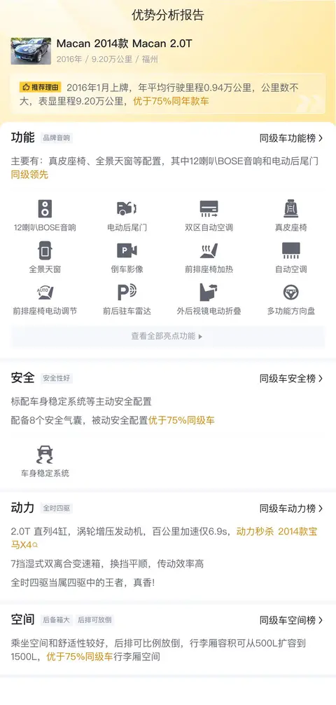 先介绍一下这辆二手Macan 2014款 Macan 2.0T的基本情况,该车上牌地为福州,上牌日期2016年1月,表显里程9.2万公里,过户次数1次。二手车现价13.58万元,相比新车含税价60.87万元,便宜了47.29万元。