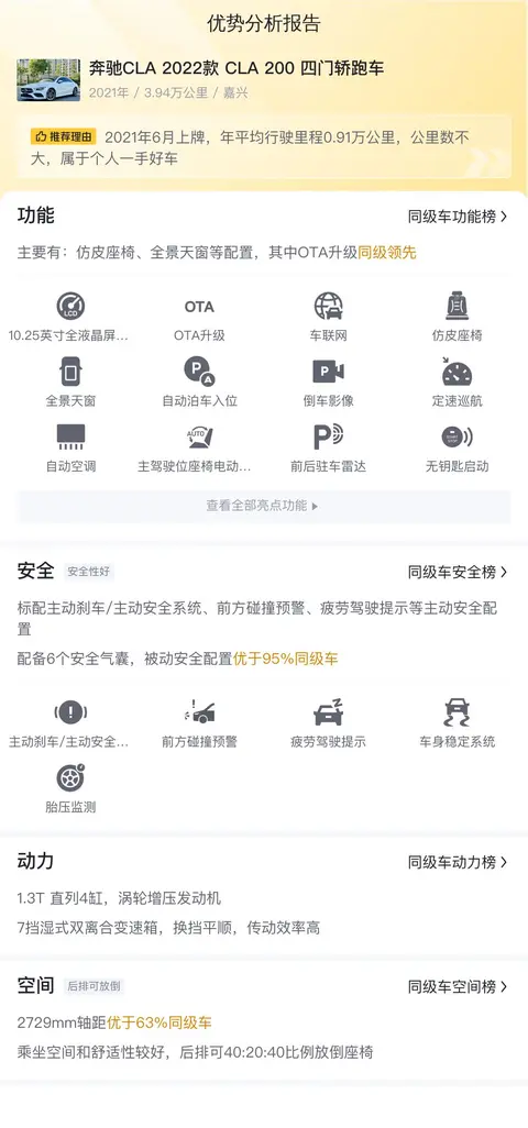报价低于市场行情,奔驰CLA 2022款 CLA 200 四门轿跑车的市场行情价是15.21万-18.75万,它的报价则是14.58万,价格上有很大优势,同时保值率也高。